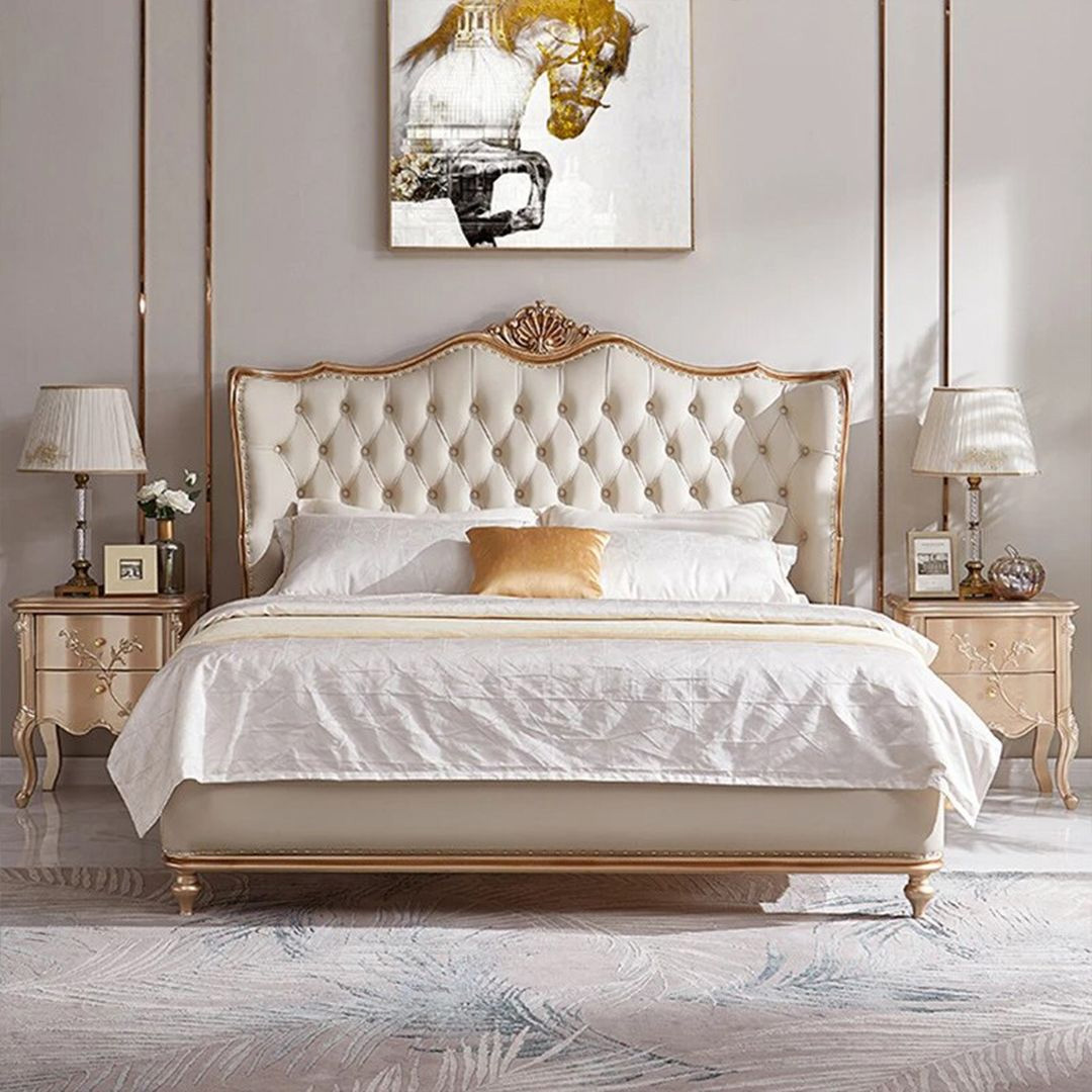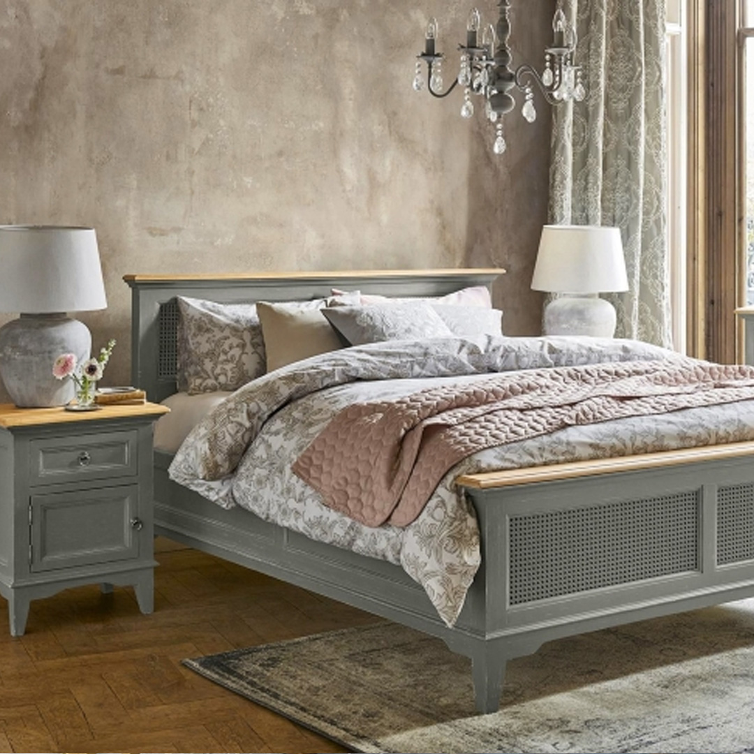 Made-to-order bed set designed with matching side tables and a stylish dressing table.