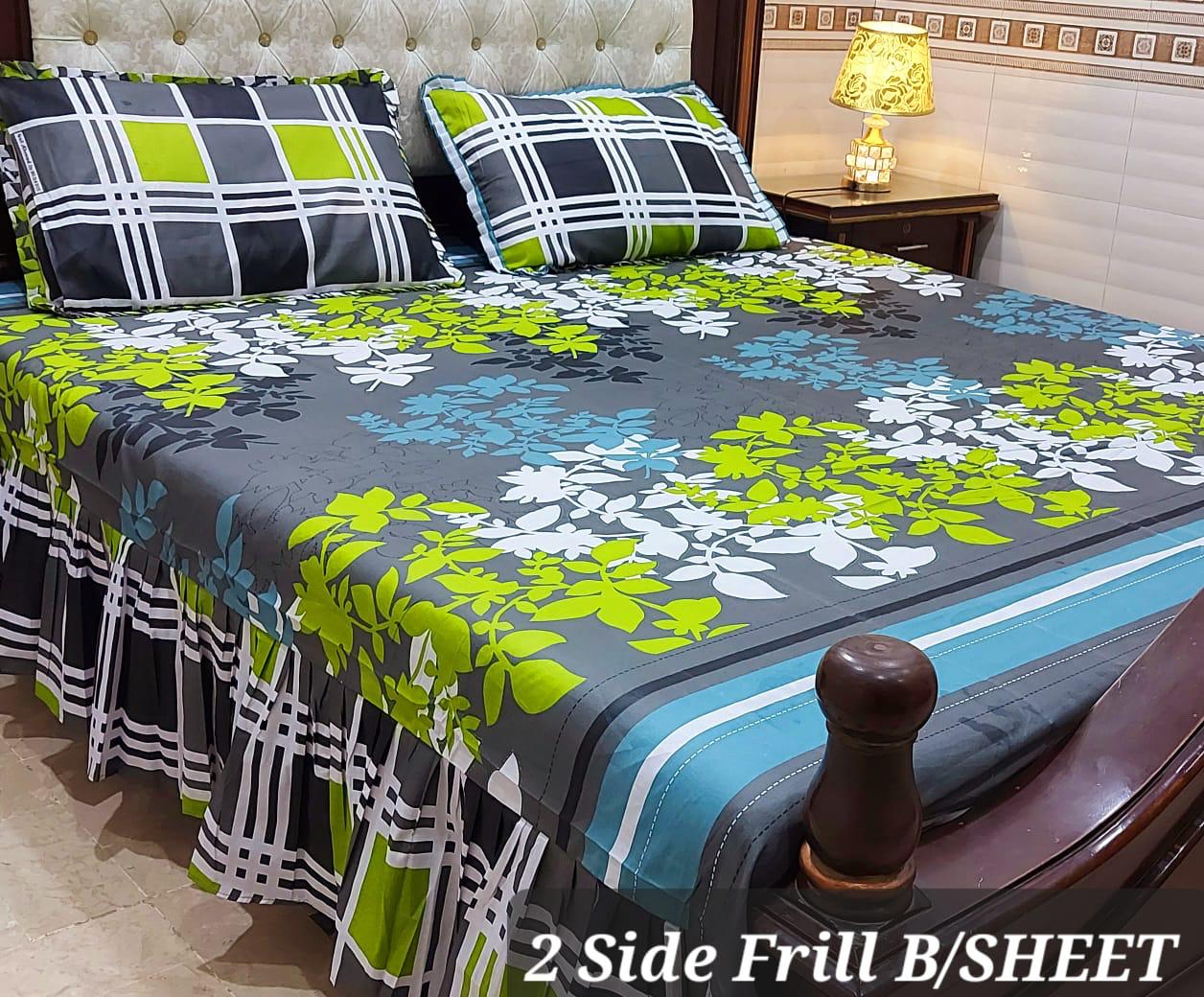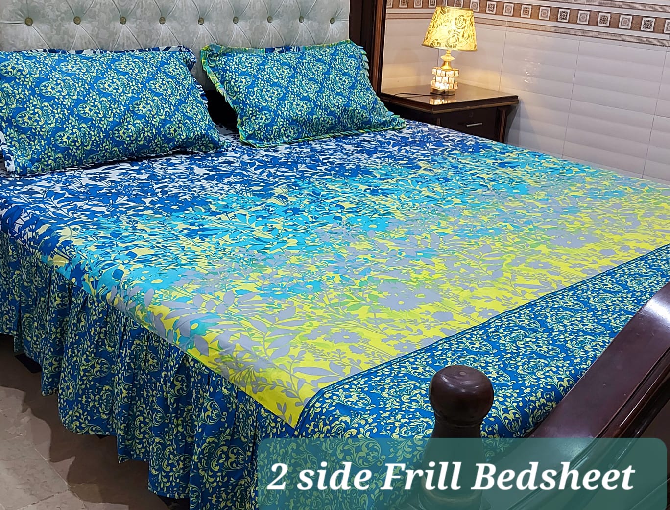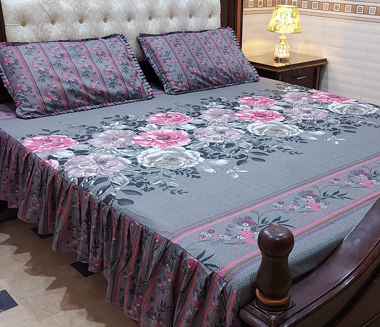 Soft cotton bedsheet with frill, includes 1 king size sheet and 2 pillow covers.